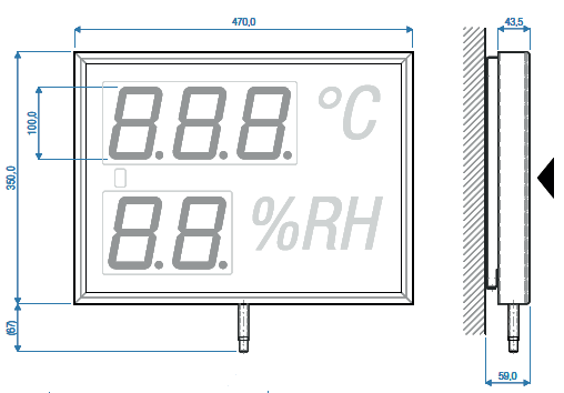 | Dígitos: Temperatura: 3 dígitos / Humedad: 2 dígitos Altura del dígito: 100mm Distancia de lectura: 50m Tipo de LED: 7 segmentos de alta luminosidad Color de LED: Rojo Ángulo de visión: 120º Unidades: Temperatura: ºC / Humedad: % Color marco: Platino mate Tipo de marco: Aluminio anodizado Pantalla Frontal: Polimetilmetacrilato Conexiones: 1 x fuente de alimentación 230VAC (cable de 2m de largo con enchufe) Tensión de alimentación: 230VAC Consumo: 6,5W Dimensiones: An.470 x Al.350 + 67 x Pr.43.5mm Peso neto: 3kg Grado de protección: IP20 (Opcional IP54) Montaje: Incluye el sistema de anclaje a pared Características del sensor Tipo de sensor: interno |